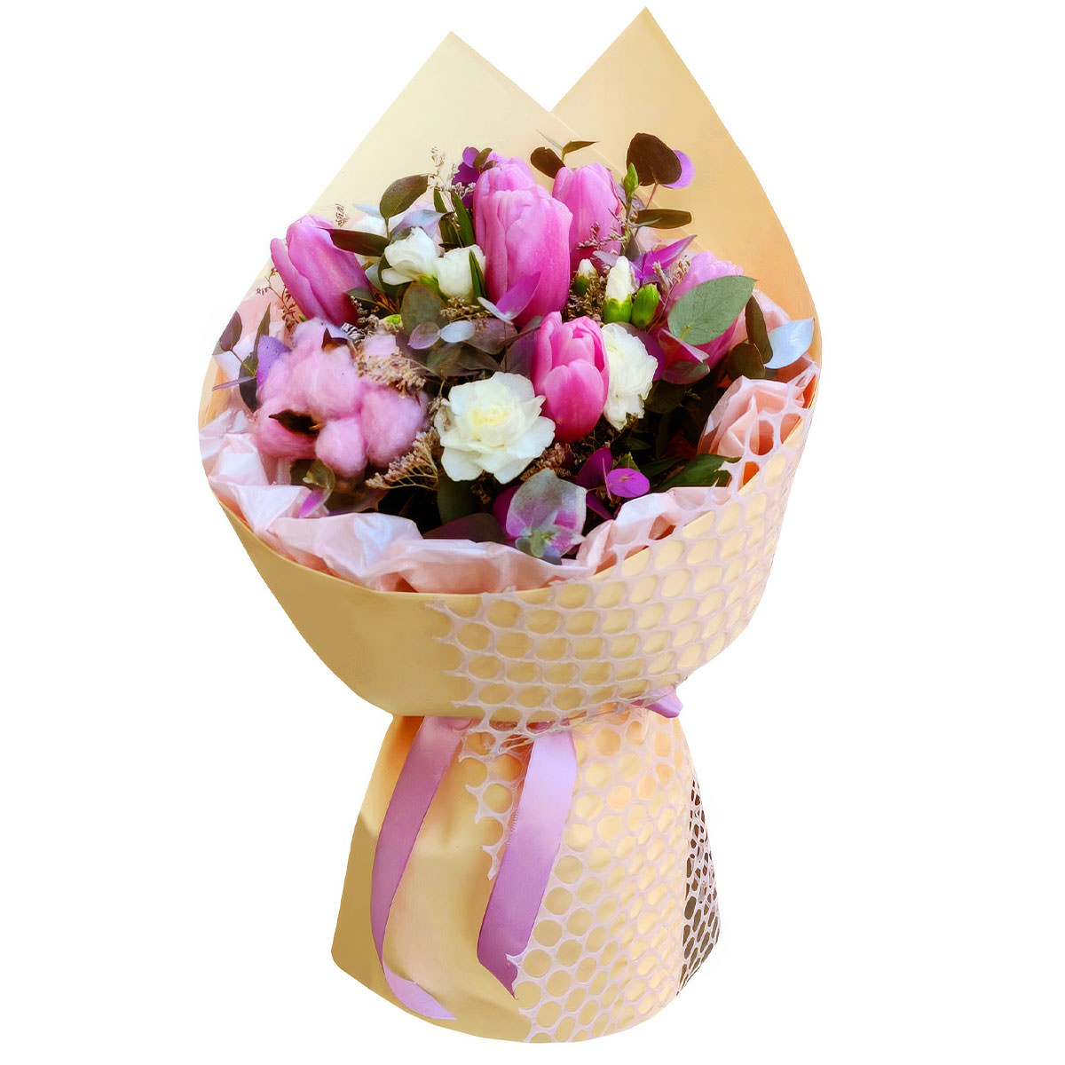Тюльпан розовый, эустома белая, хлопок, эвкалипт. Упаковка (лента, пленка, крафт, сетка, пленка матовая)