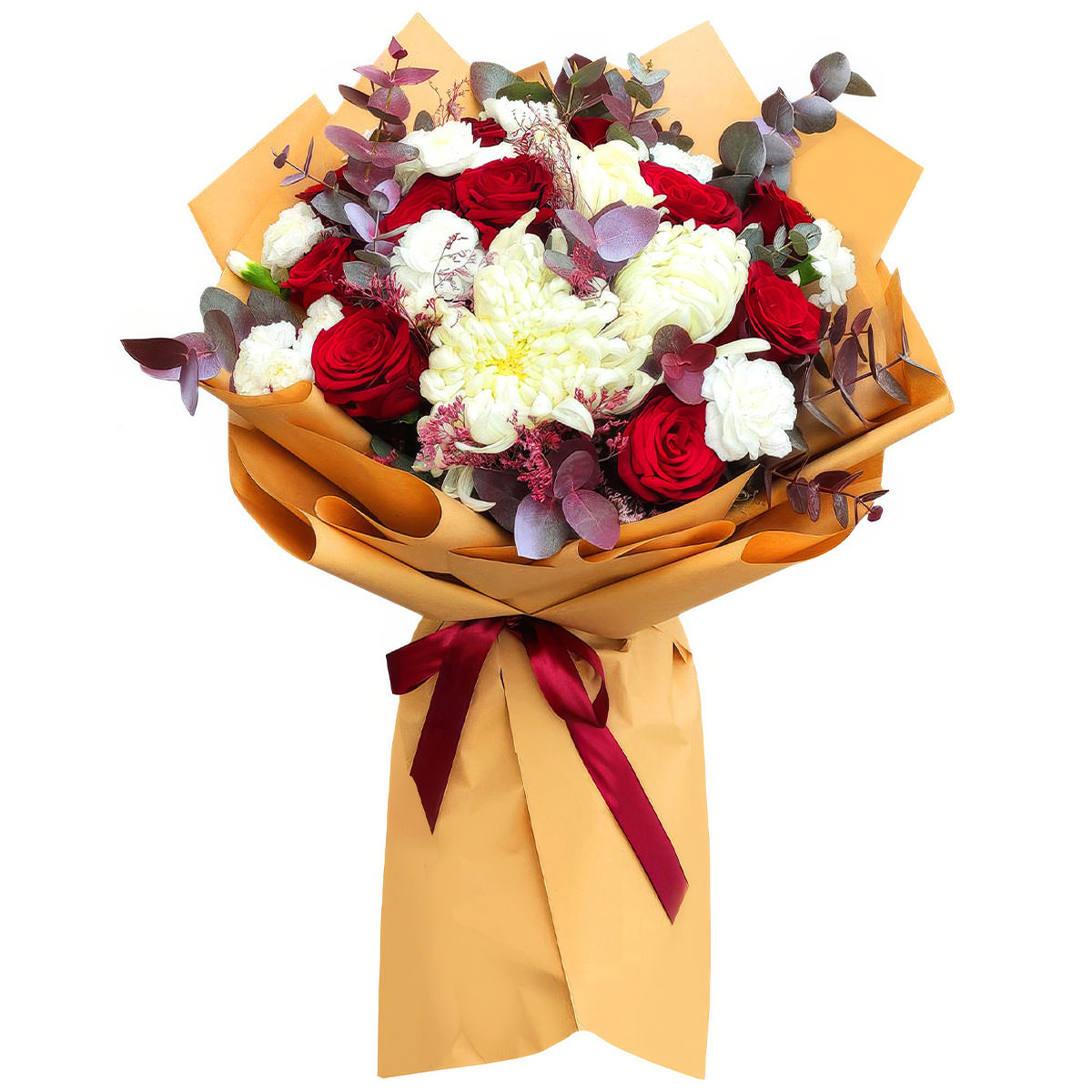 Хризантема одноголовая белая, роза одноголовая красная, маттиола белая, эвкалипт. Упаковка (лента, пленка, крафт, сетка, пленка матовая)