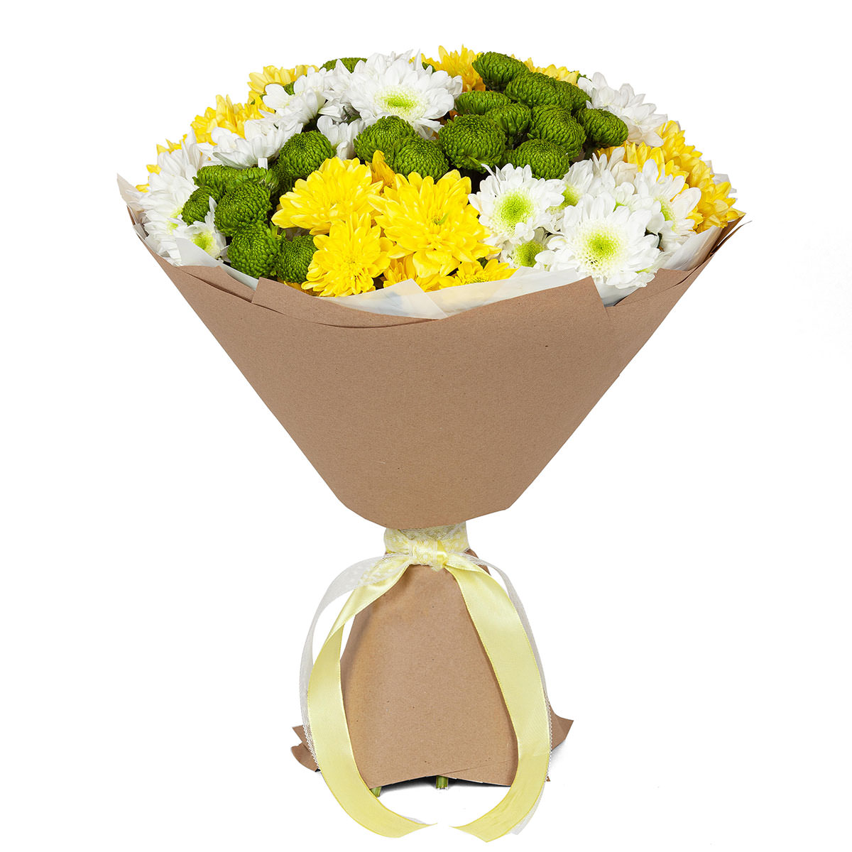 Хризантема белая, желтая, зеленая. Упаковка (лента, пленка, крафт, сетка, пленка матовая)