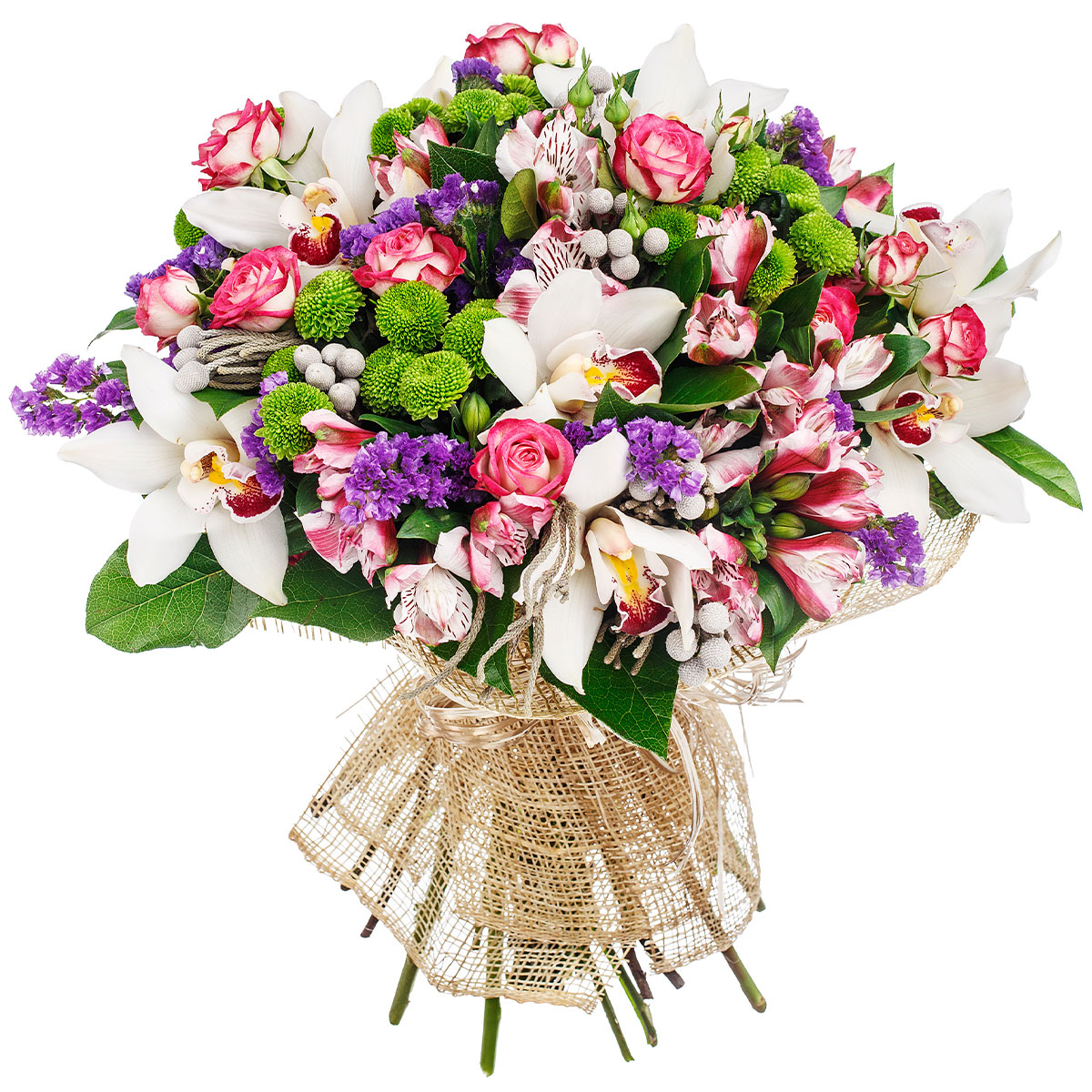Орхидея белая, альстромерия бело-красная, роза кустовая розовая, хризантема кустовая зеленая, статица фиолетовая. бруния. Упаковка (лента, пленка, крафт, сетка, пленка матовая)