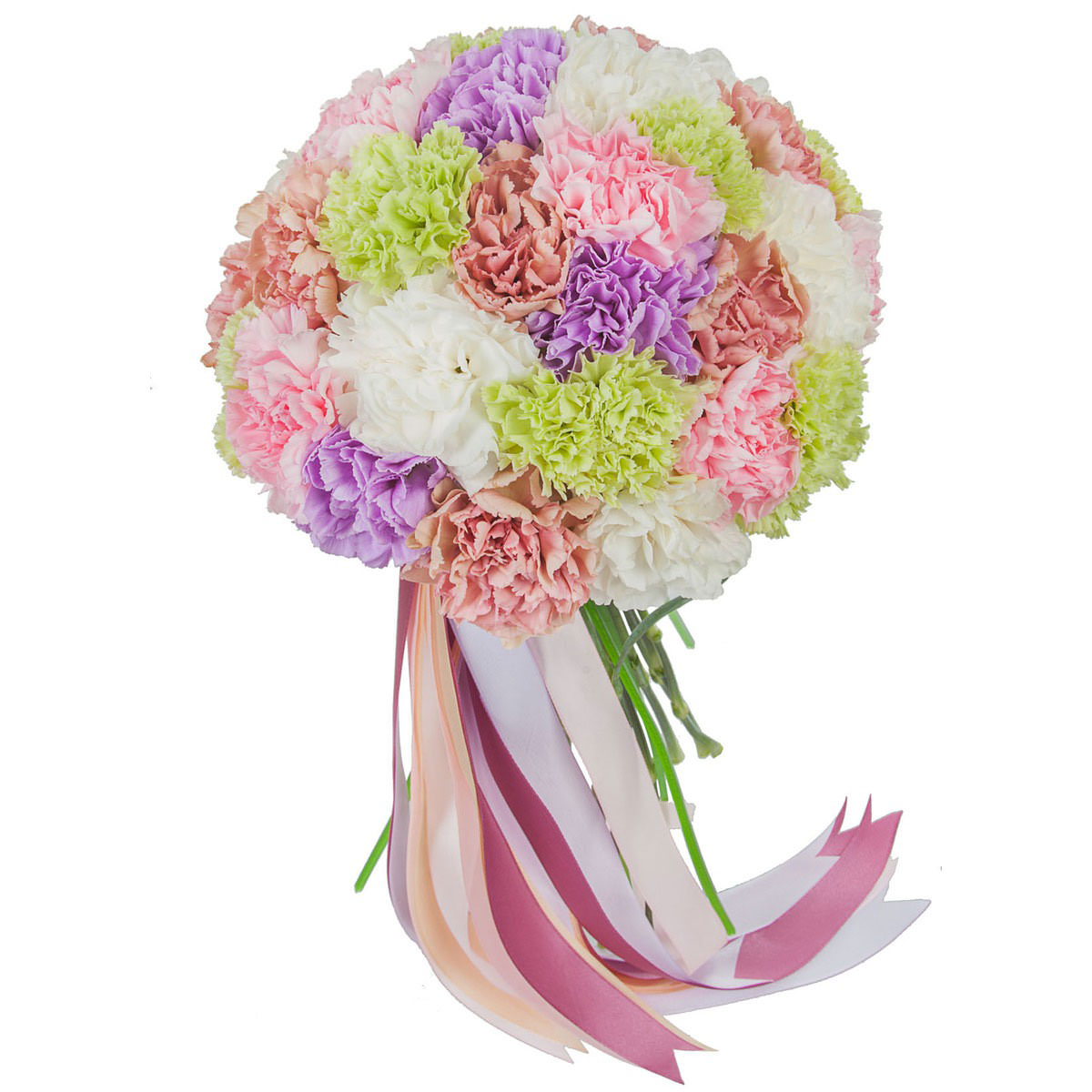 Гвоздики белые, зеленые, фиолетовые, розовые, бордовые.