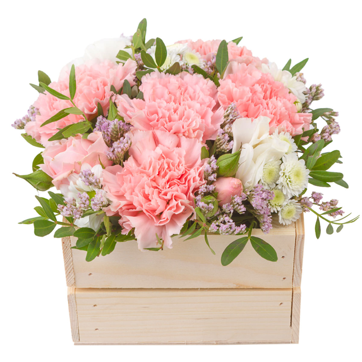 Гвоздика розовая, хризантема кустовая белая, статица, фисташка. Упаковка (Корзина, оазис, ящик).