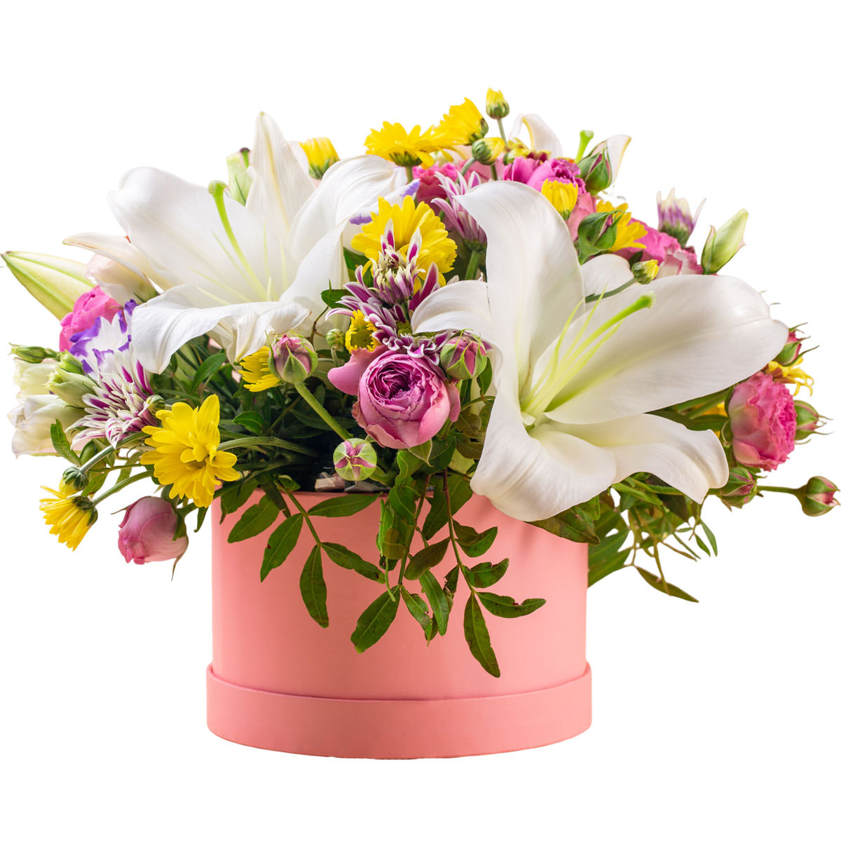 Лилия белая, хризантема кустовая желтая и сиреневая, роза кустовая пионовидная розовая, эустома бело-фиолетовая, фисташка. Упаковка (шляпная коробка, квадратный бокс, коробка сердце, оазис)