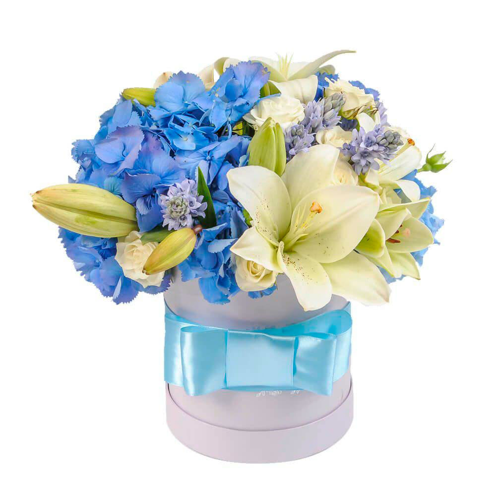 Гортензия голубая, лилия белая, роза кустовая белая, гиацинт. Упаковка (шляпная коробка, квадратный бокс, коробка сердце, оазис)