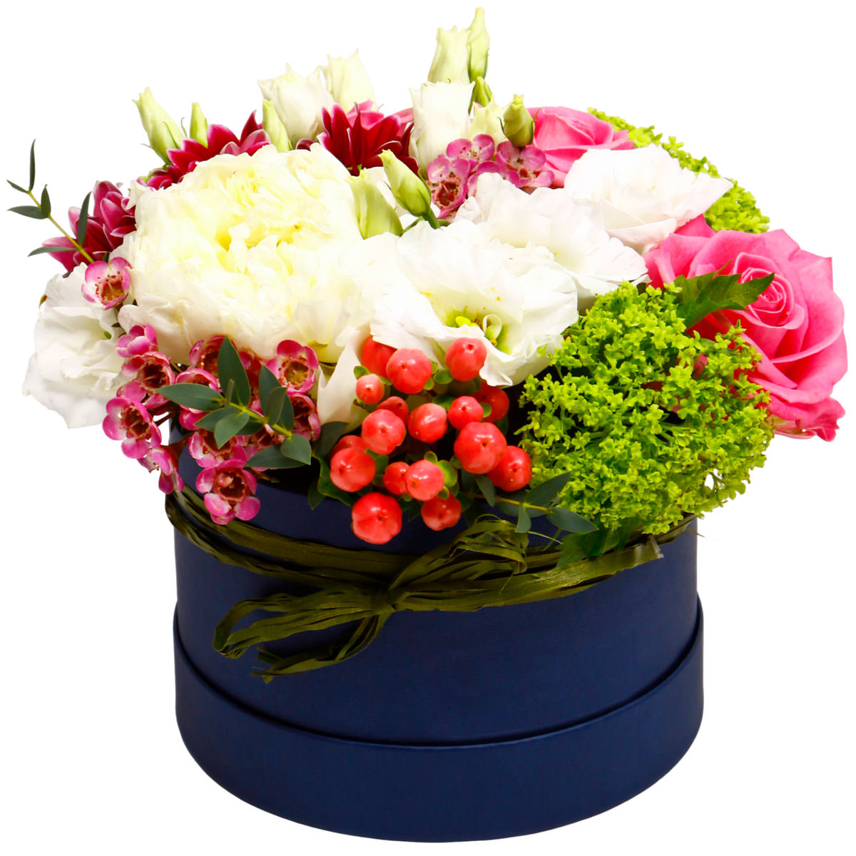 Пион белый, роза одноголовая розовая, эустома белая, хризантема кустовая розовая, ваксфлауэр, гиперикум, вибурнум. Упаковка (шляпная коробка, квадратный бокс, коробка сердце, оазис)
